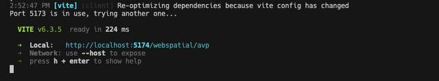 Next, open a new terminal window (in the project root) and run another Dev Server to generate web code specifically for WebSpatial, used in the WebSpatial app on visionOS (keep it running in the following steps):